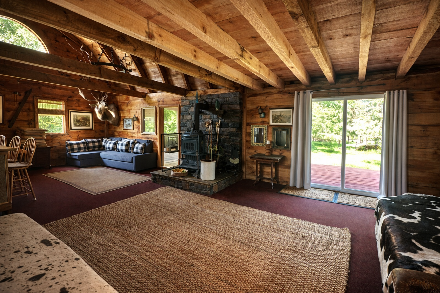 Stone fireplace · Warm, lived-in comfort